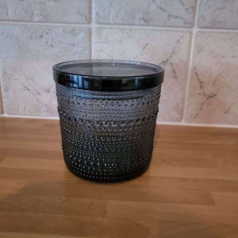 Myydään muutamia kertoja käytetty iittalan kastehelmipurkki kannella. Värinä harmaa ja Koko 11cmx11cm.
