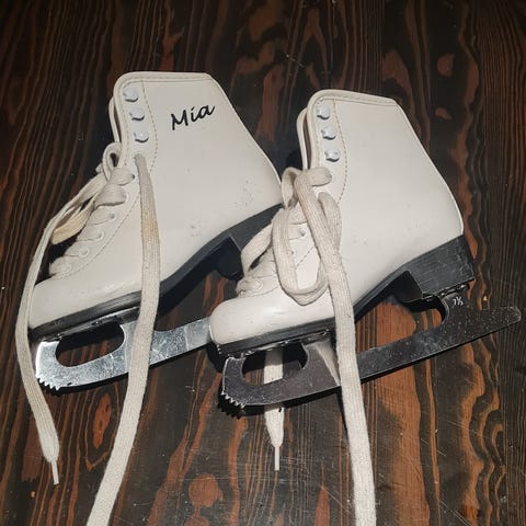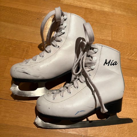 Mia luistimet. Koko 30. Pohajallisen mitta noin 19 cm. Vasemman luistimen kärjessä enemmän mustia viiruja, oikeassa vähemmän. Luistinten kunto muuten hyvä. Mukaan saa halutessaan luistimiin sopivat punaiset suojat.