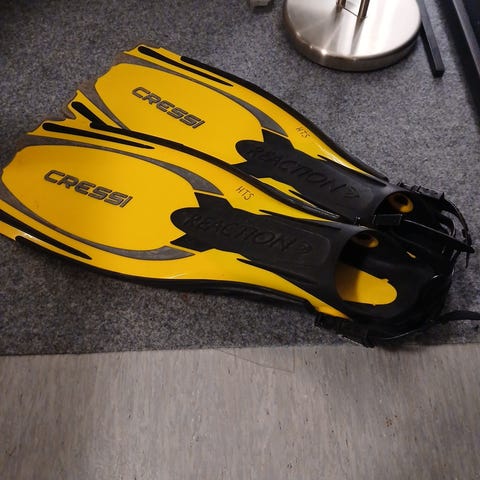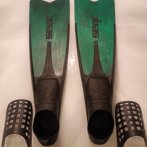 Otsikon mukaiset räpylät sukellukseen. Olleet epäsäännöllisen säännöllisessä käytössä parisen vuotta. Viimeiset 5 vuotta olleet varastossa. Kokemukseni mukaan erittäin hyvät räpylät. Soveltuu henkilölle, jonka kengän koko on 44 - 45.