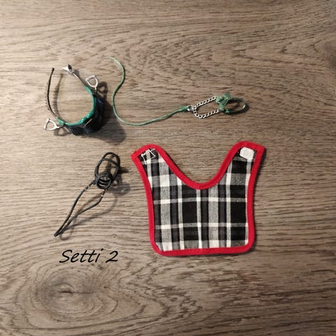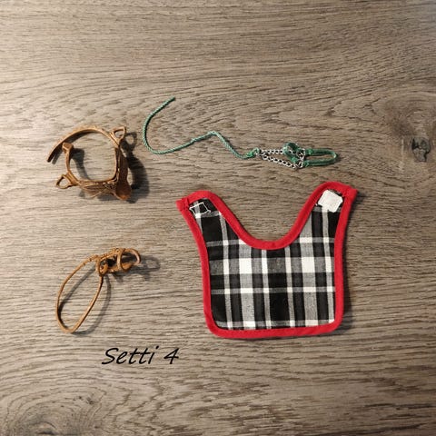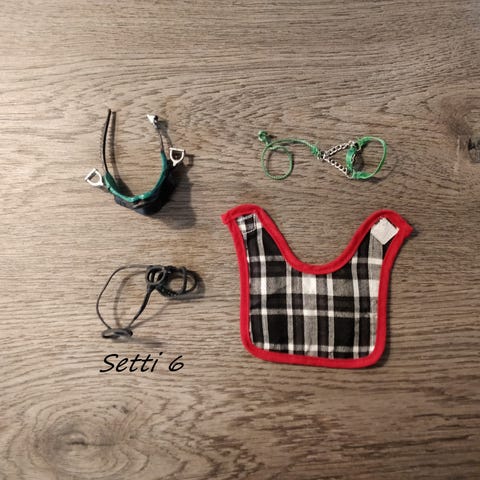 Hyvässä kunnossa olevat Schleich-tuotteet: 3 kpl satuloita ja suitsia, 3 kpl loimia eri kuoseilla ja kokoisina ja riimuja. Uutena yli 50 e arvosta tuotteita :)