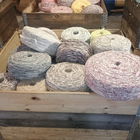 Mustaa matonkudetta/trikookudetta. 2 isompaa kerää ihan kaupasta ostettua lankaa, josta alettu kutomaan mattoa, mutta sitten purettu, eli kuin uutta. Lisäksi kaupan päälle pieni kerä mustaa ohuempaa kudetta, trikoista sekin, alkuperää en tälle muista. Lisäksi mukaan virkkuukoukku koossa 10.