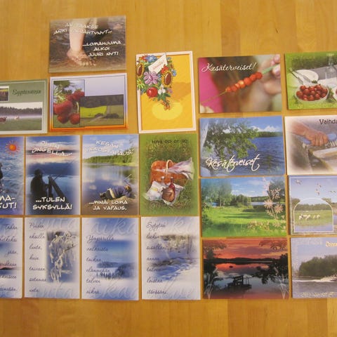 Kuvissa olevat käyttämättömät postikortit yht. 100 kpl, 20 erilaista korttia, kutakin 5 kpl. Kortin koko n. 14,7 x 10,4 cm. Hakusana: postikortti. Nouto Kuopiosta keskustasta. Pakettiautomaattilähetys Manner-Suomeen 6 euroa, josta saa lähetyksen seurantanumeron. Jos ostat kolme (3) myyntikohdettani, maksan pakettiautomaattilähetyksen Manner-Suomeen.