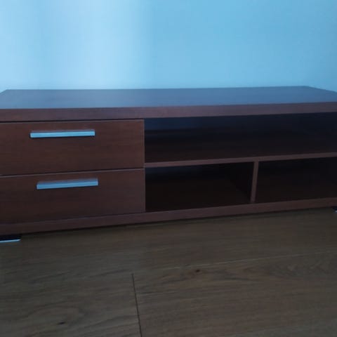 Valkoinen tv-taso. Toisessa ovessa musta viiva. Leveys: 130cm