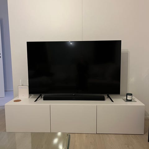 Kaksi kpl näitä https://www.ikea.com/fi/fi/p/besta-seinaeaen-kiinnitettaevae-kaappikok-valkoinen-lappviken-valkoinen-s79429664/ eli kaksi tällaista