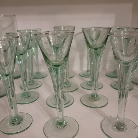 Vihertävästä uusiolasista valmistetut snapsilasit, 7kpl