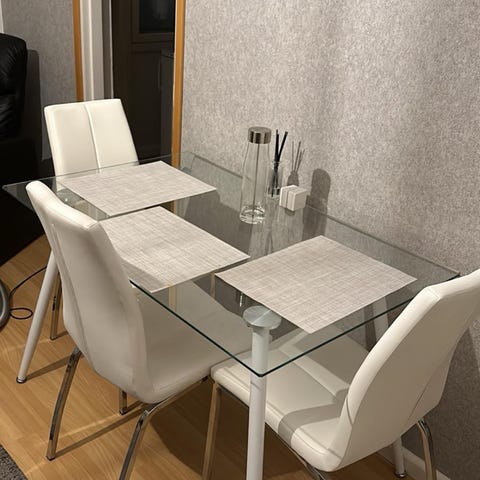 Maitolasinen pöytä, metallikehikolla ja -jaloilla. Valkoiset tekonahkatuolit, joissa kulumajälkeä. Vain nouto (la 3.1. klo 09 mennessä)