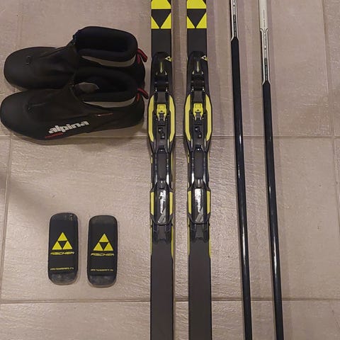 R skinit on uudenkarheassa kunnossa, pohjassa ei ole naarmuja. Hiihtolenkit jääneet muutamaan. Laadukas kokonaisuus. Sauvatkin on Onewayn worldcup sarjaa, todella kevyet.