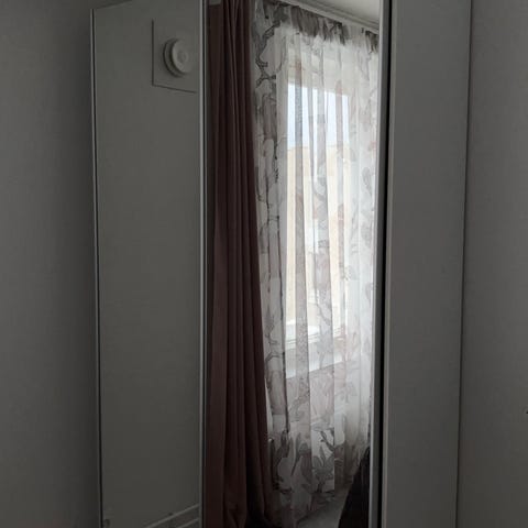 Hyväkuntoinen vaatekaappi eteisestä, mutta toimii yhtälailla makuuhuoneessa. Yksi peiliovi saranoilla 50cm ja kaksi 75cm peili liukuovea.
