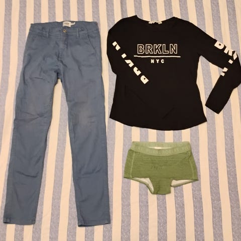 Setti jossa beiget reisitaskuhousut H&M, koko 158 sekä valkoinen pitkähihainen paita Reserved, koko 164 (vastaa kokoa 158). Olleet käytössä samaan aikaan. Housujen vyötärössä kiristyskuminauha. Paidassa kaksinkertainen kangas vartalo-osassa. Materiaali puuvillaa molemmissa. Oikein hyvässä ja siistissä kunnossa seuraavalle käyttäjälle!