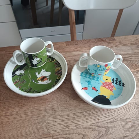 Ensiastiasto lapselle. Uusi, vain kuvaa varten käytetty kansi auki. Pikku Myy lautanen ja muki.