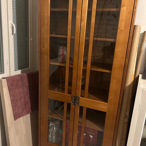 Siisti kirjakaappi kahdella liukulasiovella. Kaapin sisällä 2 hyllyä, ovessa avain. Noudettavissa 4.-10.1. välisenä aikana.