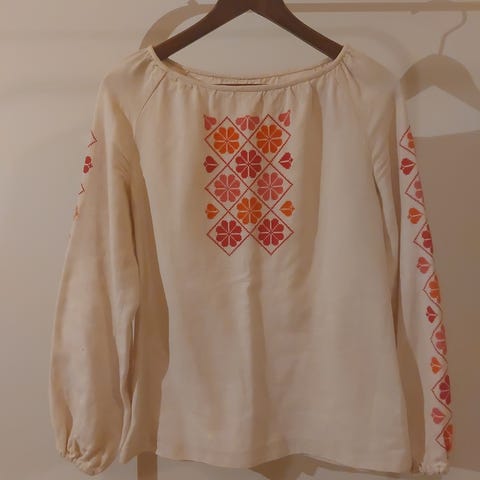 Pienellä huivikauluksella varusteltu kaunis silkkipaita. Oikeassa hihassa pieni reikä. Malli lyhyt.