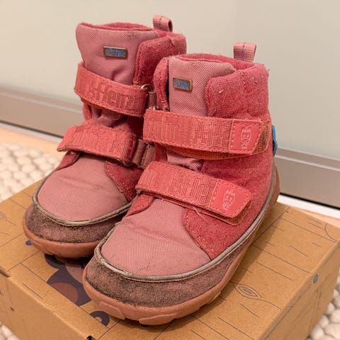Affenzahn lasten talvikengät, koko 26, unisex, harmaa/vaaleanpunainen. Renksukiinnitykset (lenkit missä nuo renkaat kiinni) näyttivät osin hapristuneilta mutta ei poikki. En ole koittanut kummemmin pestä tai puhdistella, ihan kelpo kengät seuraavalle.