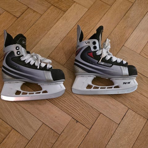 Kuvan mukaiset perus hyvät luistimet lapselle. Ei koko merkintää, pohjan mitta noin 160mm eli EU kokona 25.