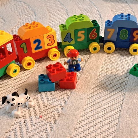 LEGO Duplo numerojuna sisältää värikkäitä palikoita, joissa on numerot 1-7, sekä kaksi hahmoa ja mustan kissan figuuri. Sopii lasten leikkeihin ja kehittää motorisia taitoja.