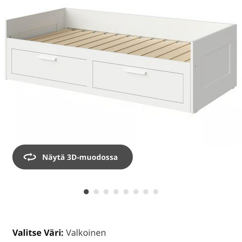 Luonnonvalkoinen sohvasänky (82x207cm) kahdella patjalla. Mahdollisuus myös levittää sänkyä, mutta muutama rautaputki hieman vääntynyt ja siksi hieman vaikeampi levittää. Patjat on paljon nukuttuja.