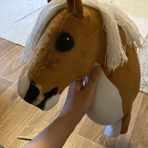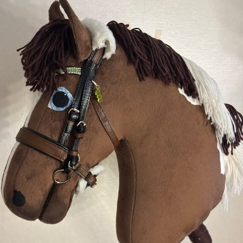 Keppihevonen, pehmeä materiaali, valkoinen villaharja, mustat silmät ja sieraimet. Corazon hobbyhorses tekemä.