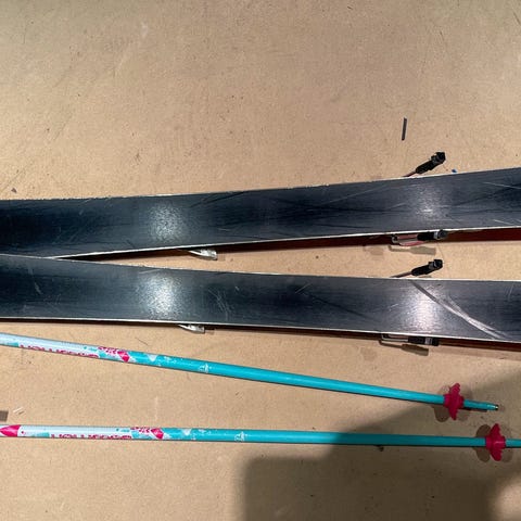 Muuten hyvässä kunnossa mutta yhden suksen kantista puuttuu 10cm eli rikki siitä kuitenki hyvät siteet