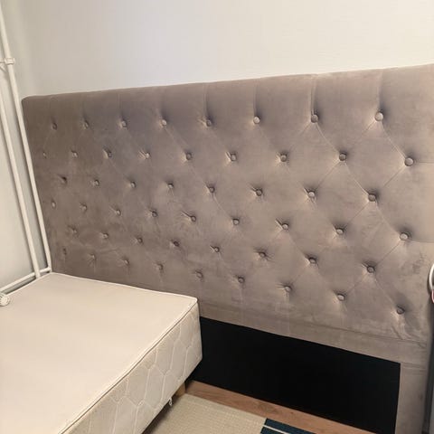 Hyväkuntoinen sängynpääty, alaosassa kaksi pientä kohtaa mistä kangas revennyt