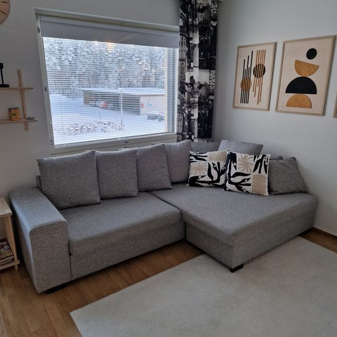 2023 ostettu sohva Maskusta. Sohva hyvässä kunnossa, muuton ja tilan takia myydään pois. Taloudessa on koira, mutta koira ei ole ollut sohvalla.