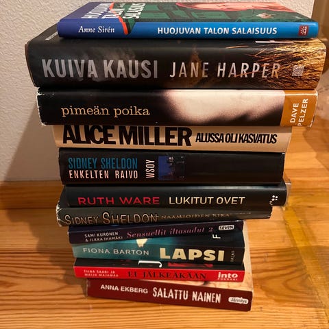 Myynnissä 39 erilaista kirjaa pakettina. Mukana mm. Elena Ferrantea, Lucinda Rileya, Jane Eyre, Astrid Lindgreniä, J.K. Rowlingia, Jane Austenia ja monia muita. Kaikki kirjat ovat suomenkielisiä, paitsi Jane Eyre, joka on englanninkielinen.