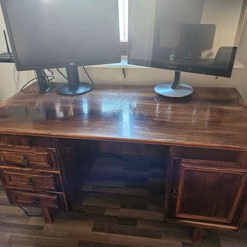 Jalat on vähän kierot ja kiikkerät, puinen levy on paksu, muutaman sentin. Päällipuolella yksi reikä / halkeama ja pohjassa useampia reikiä eri jaloista. Tästä varmasti joku tee-se itse ihminen saa kauniin työpöydän. Levy on joskus itse tehty. Ollut vuosia käytössä.