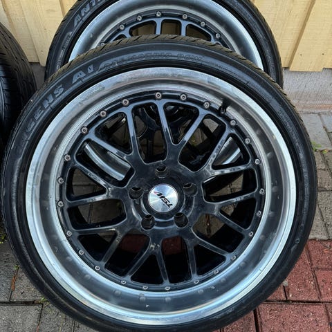 Edessä lähes uudet renkaat ja takana vaihto kunnossa.