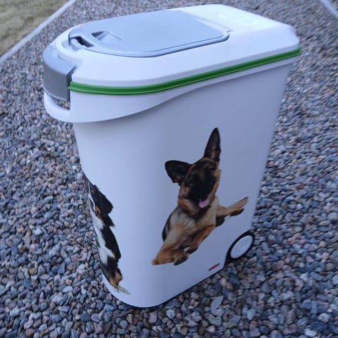 Hajutiivis ja käytännöllinen säilytysastia koiranruoalle. Pitää ruoan hyvänä eikä levitä hajuja. Astiaan mahtuu kokonainen 12 kg säkki. Helppo käyttää ja puhdistaa. Hyväkuntoinen, olen ollut itse erittäin tyytyväinen.