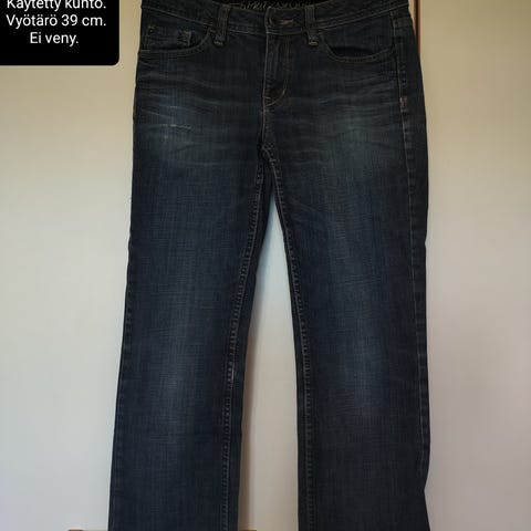 Vähän korkeammalla vyötäröllä varustetut erittäin hyväkuntoiset tummansiniset farkut, koko 31/32. Ei juuri mitään käytön jälkiä ja materiaali erittäin tukevaa 100% puuvillaa.