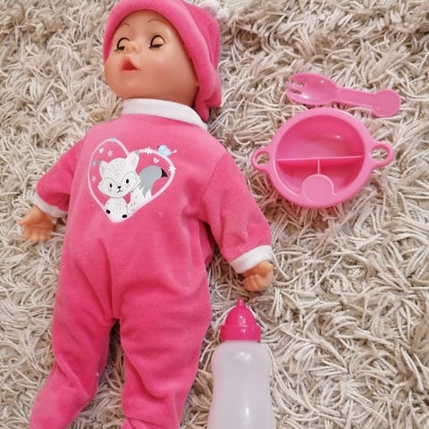 Nukke, kylpyamme, kylpytakki, pikkarit ja tuttipullo. Sopii myös vesileikkeihin. Nuken saa pissimään veden kanssa 😄. Siisti ja ehjä.