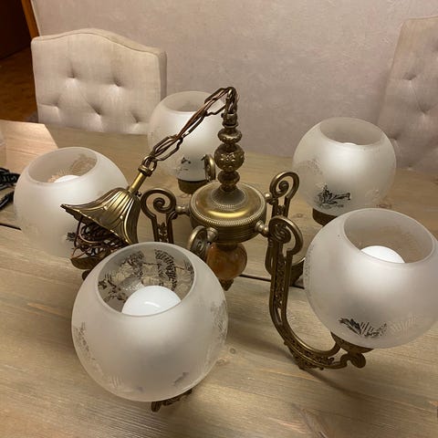 Todella kaunis 1950-luvun romanttinen Sarion valaisintehtaan 5-kupuinen messinkivalaisin vanhoilla opaalilasikuvuilla (valmistajan leima rungossa - viimeinen kuva). Valaisimessa on kauniisti patinoitunut messinkirunko ja romanttisen koristeelliset sähköosien päällä olevat messinkiset kupit ja mansetit. Valaisimessa on lisäksi todella hienot messinkiset kiiltävät lehtikoristeet rungon keskiössä ja messinkiset jousikoristeet sekä alakuvun että mansettien alla. Valaisin on varustettu Riihimäen lasitehtaan tuotannossa 1950-luvulla valmistetuilla vanhoilla pyöreämuotoisilla valaistusaukostaan rypytetyillä täysin ehjillä opaalilasikuvuilla, joiden läpi valo siivilöityy lämpimästi ja valaisee häikäisemättömästi viidellä valopisteellä suuremmankin huoneen. Kuvut on esitelty esim. Itsun vuoden 1956 kuvastossa mallinumerolla 1406 maalattu väriopaalikupu ja näitä kupuja käyttivät valaisintehtaat Suomessa yleisesti. Valaisimessa on aikakautensa mukaiset sähköosat ja maadoittamattomat sähköt. Uudet led-polttimot sisältyvät hintaan. Valaisinpistokkeesta voidaan sopia tarpeen mukaan erikseen.