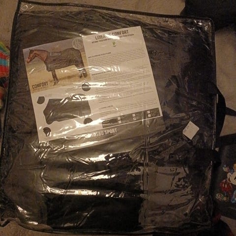 Ylimääräisenä vanha kunnon Hansbo kombiloimi Suomi-väreissä. Selkämitta mitattuna 150 cm, ollut 145 cm loimia käyttävällä. Käytön jälkiä on, parista kohtaa siististi korjattu, ks. kuvat. On konepesun jäljiltä, joitain tahroja on, en ole kokeillut esim. valkaista. Nostalgiahenkiselle löytö 😊