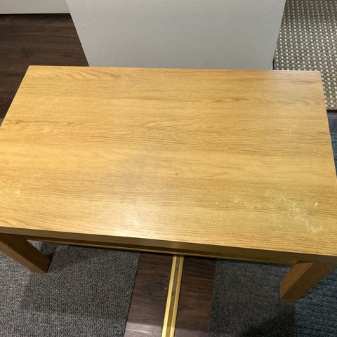 Ges bort ett vitt IKEA LACK soffbord (90x55x45 cm) p.g.a. flytt. Bordet är använt och har några repor samt små fläckar, men är fortfarande fullt användbart.