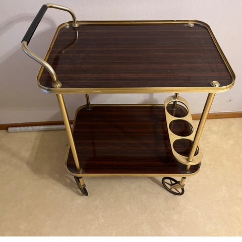 Tarjoilukärry, jossa on kaksi tasoa ja pyörät helppoon liikutteluun. Nouto erikseen sovittuna ajankohtana.