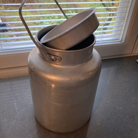 Myydään metallinen maitoastia/maitotonkka, jossa kantokahva. Materiaali metalli, väri hopeanharmaa.