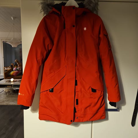 Hyväkuntoinen Ahkka parkatakki, lämmin talvitakki. Ainut mitkä on selkeästi kuluneet, on takin sisätaskussa olevat muoviset tuotelaput, jotka on varmaan pesussa ja käytössä hankautuneet (näkyy viimeisessä kuvassa). Vyötäröä voi kiristää istuvammaksi nyöristä takin sisältä. Väri hieman violettiin taittava viininpunainen.