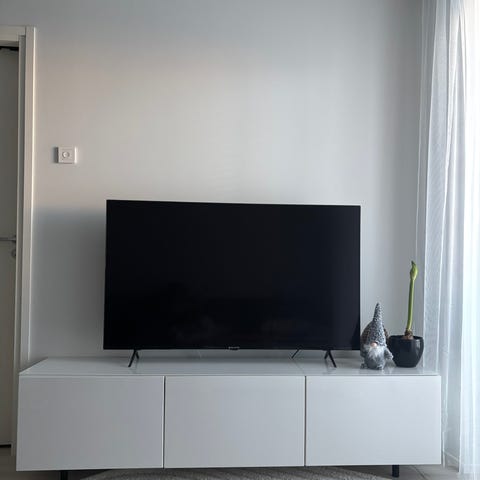 TV-taso seisoo erittäin tukevasti ja notkumatta isommankin television alla kauniiden Bestå sarjan valkoisten säädettävien puujalkojen sekä Bestå sarjan omien tukijalkojen varassa. Jalkojen ansiosta kokonaisuus nousee irti lattiasta, mikä tekee kalusteesta ilmavamman ja helpottaa sen alta siivoamista.