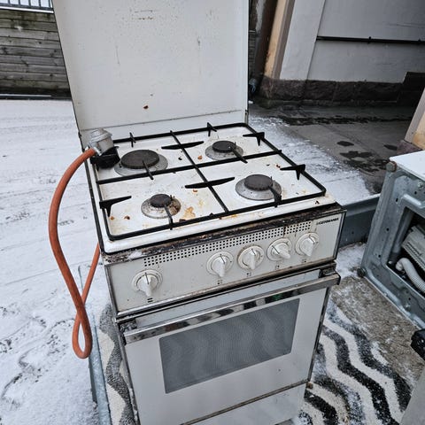 Kuvien mukainen klassikko kaasuliesi kaupan. Liesi toimii. Kaasupullon liitin/paineensäädin mukana.