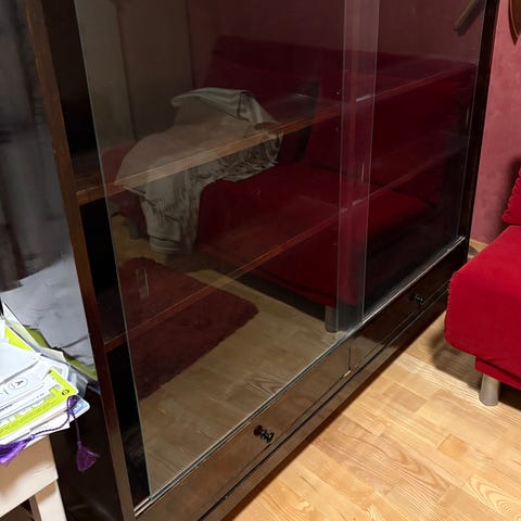 Vitriini. Leveys 136cm, korkeus 112,5cm, syvyys 44cm. Lasiovet. Lasihyllyt. Kaksi valkoista puuovea. Käytön jälkiäkin löytyy jonkin verran. HUOM! Ei voi purkaa (ei mahdu esim. moneen farmariautoon). Lasiovet ja hyllyt saa irti kuljetuksen ajaksi. Kuvan kuljetus alusta ei sisälly hintaan. Viikonlopun aikana hakevalle 50 eurolla pois autotallista