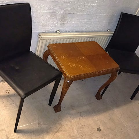Kaksi kevyttä tuolia metallirungoilla. Ruokapöydän tuolit. Nahkaiset istuimetvon antikoidun näköisiä. Ei kulumia tai vikaa, siistit hajuttomat tuolit.