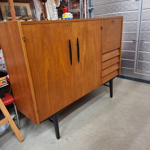 Vanha Fisherin stereokaappi. Maalipinnat hyvässä kunnossa, ei naarmuja. Renkaat helpottavat siirtelyä.