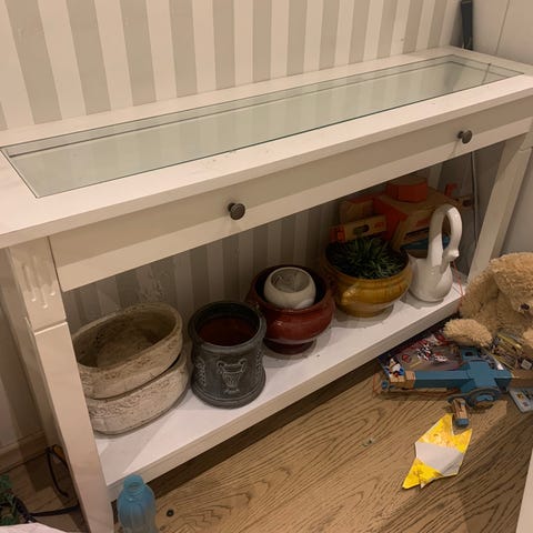 Myydään hieno kukkapöytä / sivupöytä, jossa runko kultaisen väristä metallia ja tasot valkoista lasia. Leveys 110cm, syvyys 30cm ja korkeus 80cm.