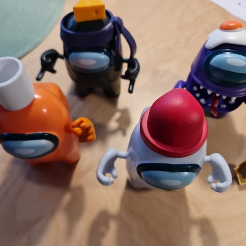 Among Us -pelin muoviset hahmot, yhteensä 5 kappaletta eri väreissä. Hahmot ovat pieniä ja soveltuvat keräilyyn tai leikkeihin.