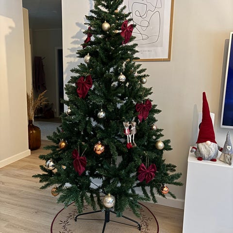 Kuusen korkeus on 2 metriä. Hintaan kuuluu koristeet, tähti, valot ja jalka.