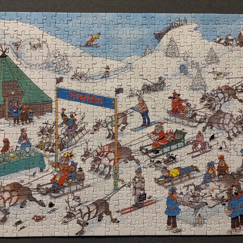 Palapelin kuva-aihe on värikäs, yksityiskohtainen ja siinä seikkailevat tutut hahmot Jan van Haasterenin tunnistettavaan tyyliin.