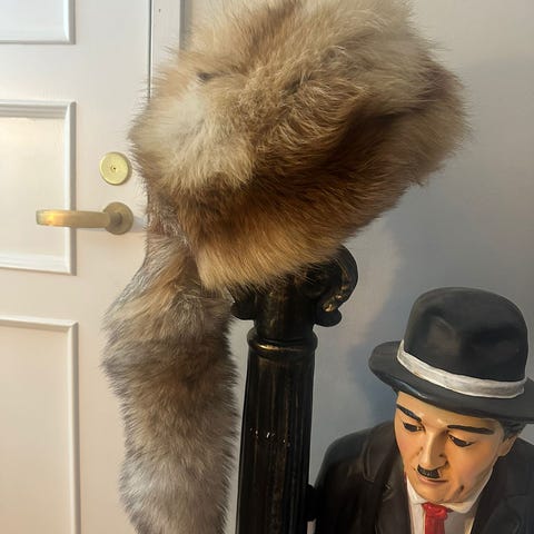 Aitoa piisamiturkista, vanha hattu ja kaulus. Hatun reuna jäännyt viimeistelemättä, mutta voi silti pitää hattua. Hatun ympärysmitta on 56cm ja korkeus on 19cm.