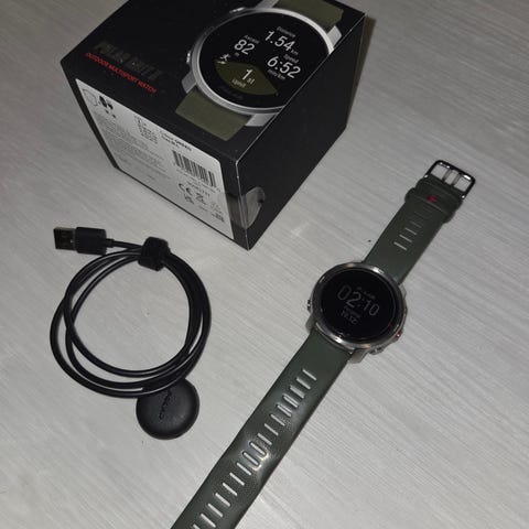 Polar Grit X urheilukello tummanvihreällä rannekkeella. Toimii niinkuin pitääkin, akunkesto ei ole enää uutta vastaavassa kunnossa mutta kohtuukäytössä on riittänyt itselläni ainakin ihan riittävästi, toki jatkuvassa käytössä voi vaatia enempi latailua (akun voi vaihtaa Polarin liikkeessä). Muuten on kaikin puolin toimiva. Rannekkeesta on mennyt rikki lenkki mikä pitää tuon rannekkeen ylimääräisen "lipareen" paikallaan mutta oon korvannut sen nippusiteellä/pienellä hiuslenkillä joka ajanut asiansa moitteettomasti, uuden sais varmaan myös liikkeestä.