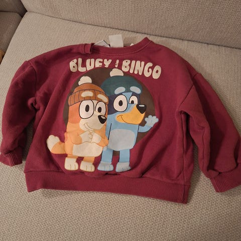 Zara Bluey lasten collegepaita viininpunainen-ruskeasaa värissä. Kokomerkintä 110, mutta selvästi pienempää kokoa, varmaan jopa 86 kokoiselle hyvä mallinsa vuoksi.