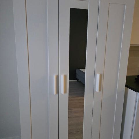 Siisti vaatekappi, jossa kolme laatikkoa, vaaterekki ja kolme hyllyä