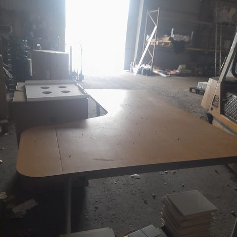 Jokikalusteen työpöytä (pituus 170 cm, syvyys 120 cm/80 cm ja korkeus 73 cm).